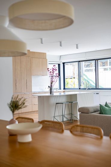 Relocated living areas: The living spaces were moved to the back and large windows and stacking doors installed, maximising sunlight and creating a strong connection to the backyard.