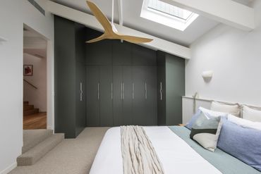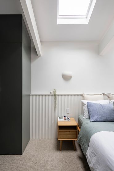 Master bedroom transformation: The original sunken lounge with its raked ceiling was reimagined as a luxurious master bedroom complete with ensuite, feature joinery robes, and two skylights, brightening the previously dark room.