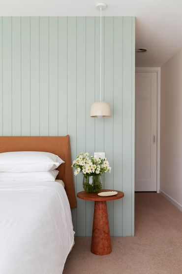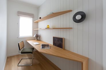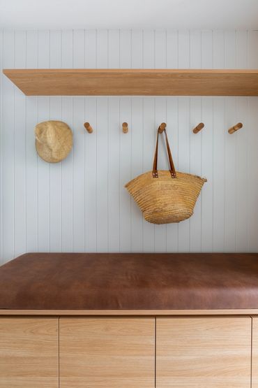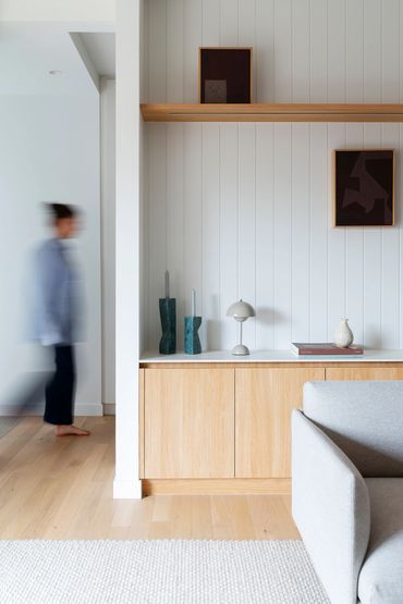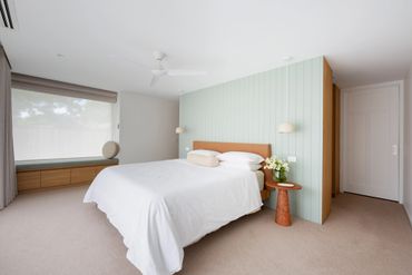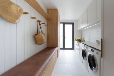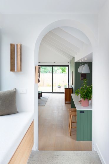 The home's interior design masterfully blends functionality with sensory delight, embodying a contemporary farmhouse aesthetic. Custom joinery solutions maximise storage and practicality, while unique, high-quality finishes, such as curved v-joint panelling, Venetian plaster, and polished concrete, add layers of texture and sophistication. The dramatic cathedral ceiling, executed to perfection with false beams and rafters, stands as the hero of the home, creating a sense of grandeur and warmth. To enhance the living experience, biophilic and experiential design principles were thoughtfully integrated. Strategically placed window seats, 'pause points,' invite moments of stillness and connection with the surrounding environment. Furthermore, a clear sightline from the front door through the home to the backyard creates an inviting sense of flow and openness. Functionality and accessibility were also paramount, with a single-level extension designed to support aging in place and an integrated utility zone streamlining daily tasks.